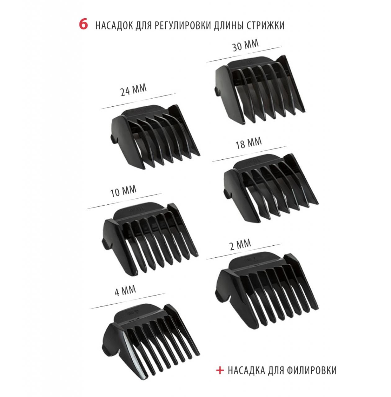 - Насадки: 7 съемных регулируемых насадок 4/7/10/18/24/30 мм, насадка для филировки